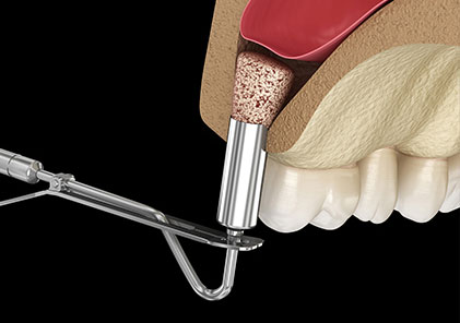 잇몸을 많이 열지 않고 인공뼈를 이식하기 때문에, 수술시간과 통증 모두 적은 편입니다. 또한 임플란트 식립이 동시에 가능합니다.